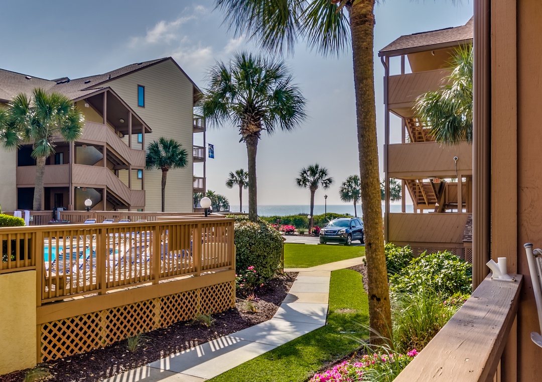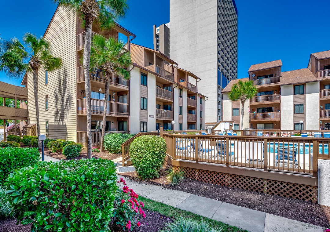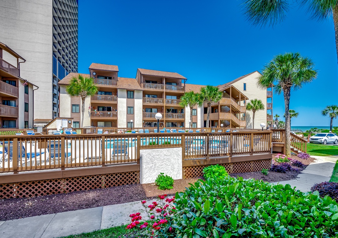 The complex is centered around a lush tropical courtyard with a large outdoor pool and deck. The deck includes lounge chairs for you to enjoy a day around the pool. There are multiple outdoor grills located on each side of complex as well. In front of Anchorage I and Anchorage II, you will find a playground, memorial park, exercise trail, private walkway to the ocean, outdoor showers and private beach gazebos for our guest to enjoy. Elevators and handicap ramps are located on each side of the complex and are easily accessible. Condos feature full size washer/dryer, flat screen TVs, and high-speed internet. Ample parking is available.
