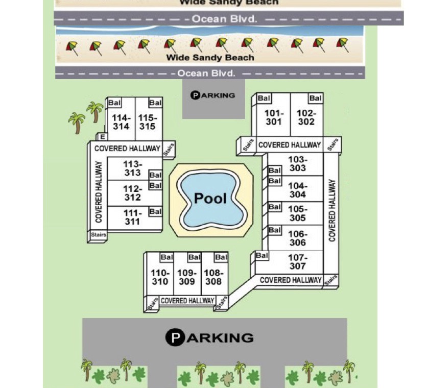 The complex is centered around a lush tropical courtyard with a large outdoor pool and deck. The deck includes lounge chairs for you to enjoy a day around the pool. There are multiple outdoor grills located on each side of complex as well. In front of Anchorage I and Anchorage II, you will find a playground, memorial park, exercise trail, private walkway to the ocean, outdoor showers and private beach gazebos for our guest to enjoy. Elevators and handicap ramps are located on each side of the complex and are easily accessible. Condos feature full size washer/dryer, flat screen TVs, and high-speed internet. Ample parking is available.