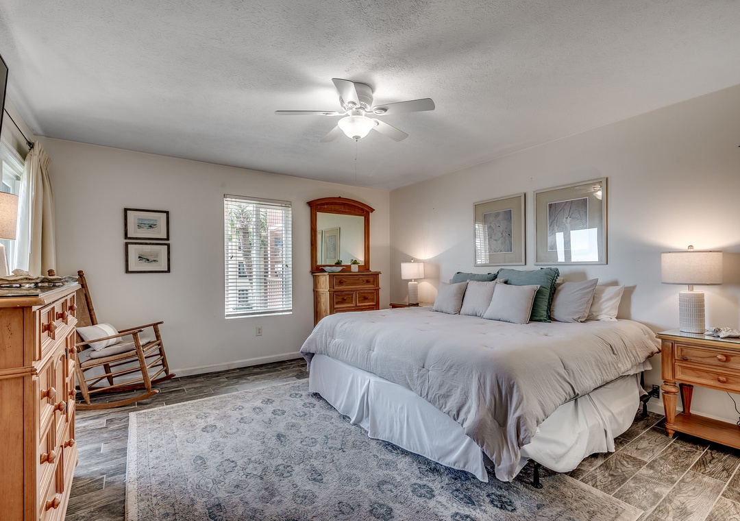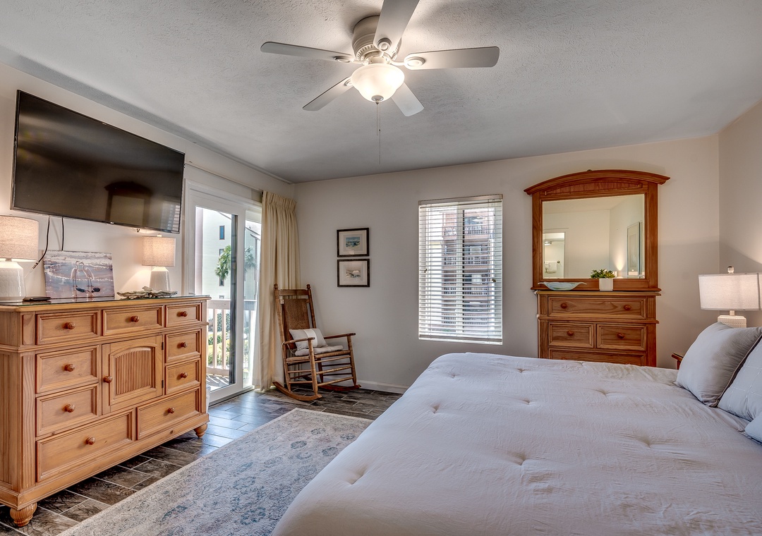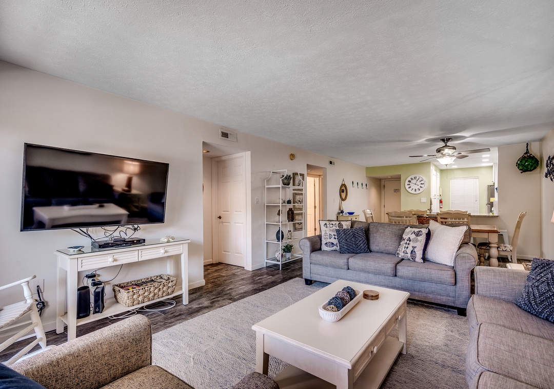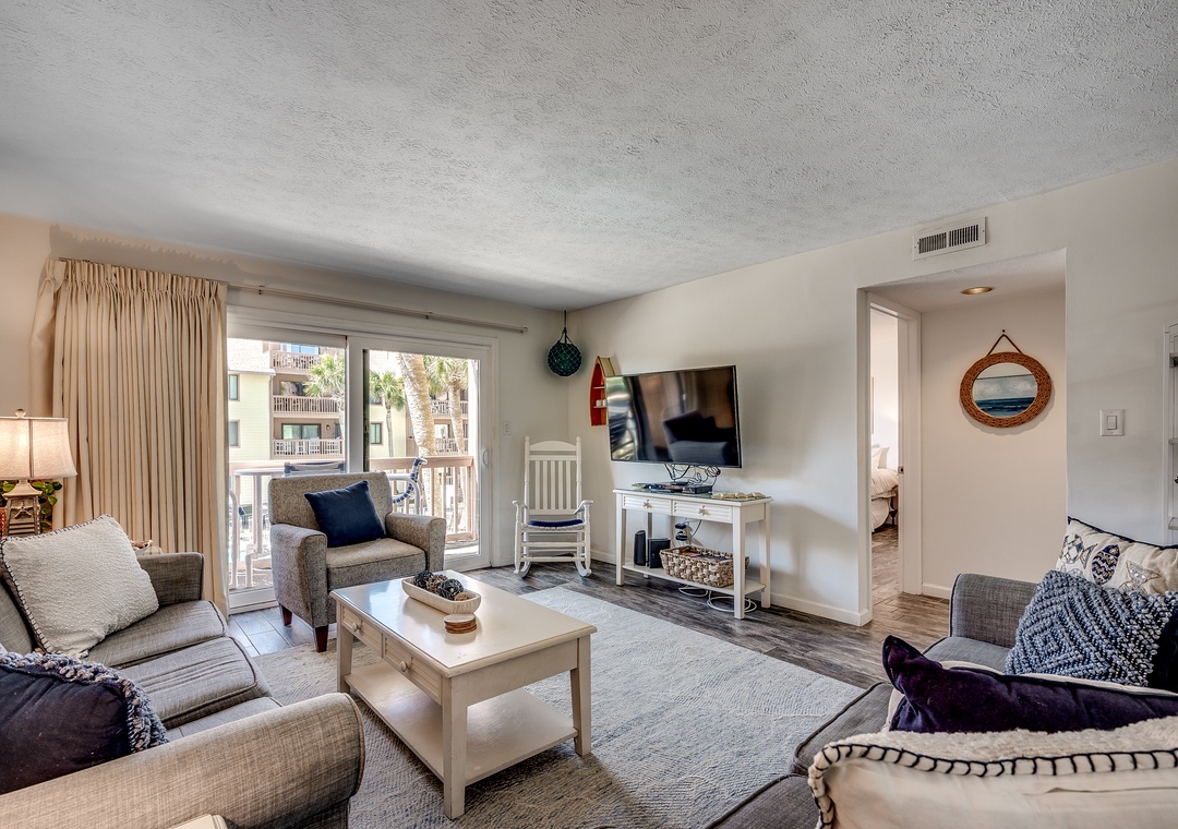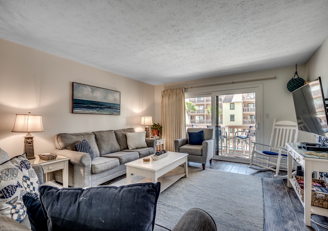 The primary bedroom offers a king bed and private bathroom, while the additional bedroom includes two twin beds and its own bathroom. A sleeper sofa in the living room provides additional accommodations. This layout makes the condo ideal for families, couples traveling together, or friends seeking a relaxing seaside escape.