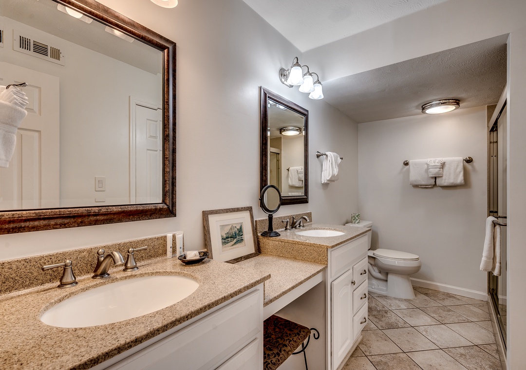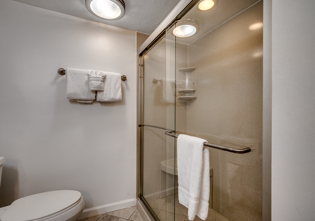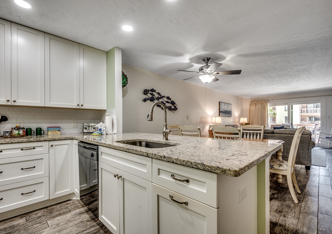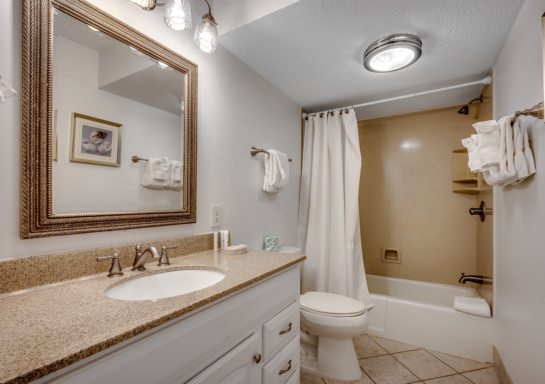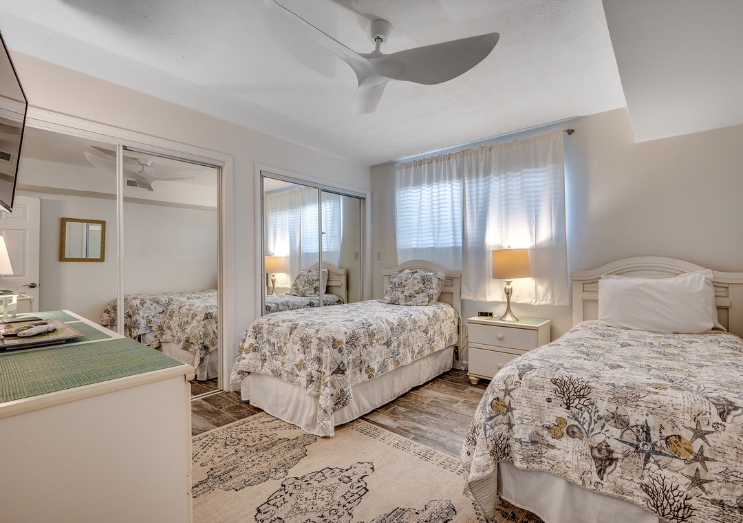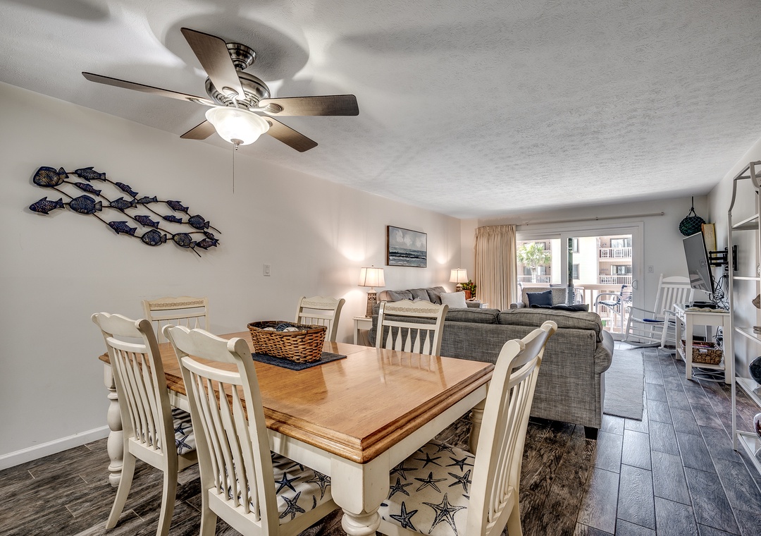 The primary bedroom offers a king bed and private bathroom, while the additional bedroom includes two twin beds and its own bathroom. A sleeper sofa in the living room provides additional accommodations. This layout makes the condo ideal for families, couples traveling together, or friends seeking a relaxing seaside escape.