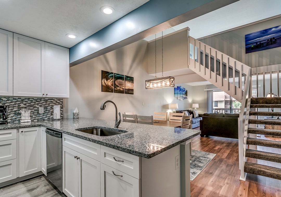 The fully equipped kitchen features full-size appliances and everything needed to prepare meals during your stay. The open-concept living and dining area provides generous seating and access to the private balcony, where you can enjoy sunrise coffee or unwind while watching the sunset over the Atlantic.